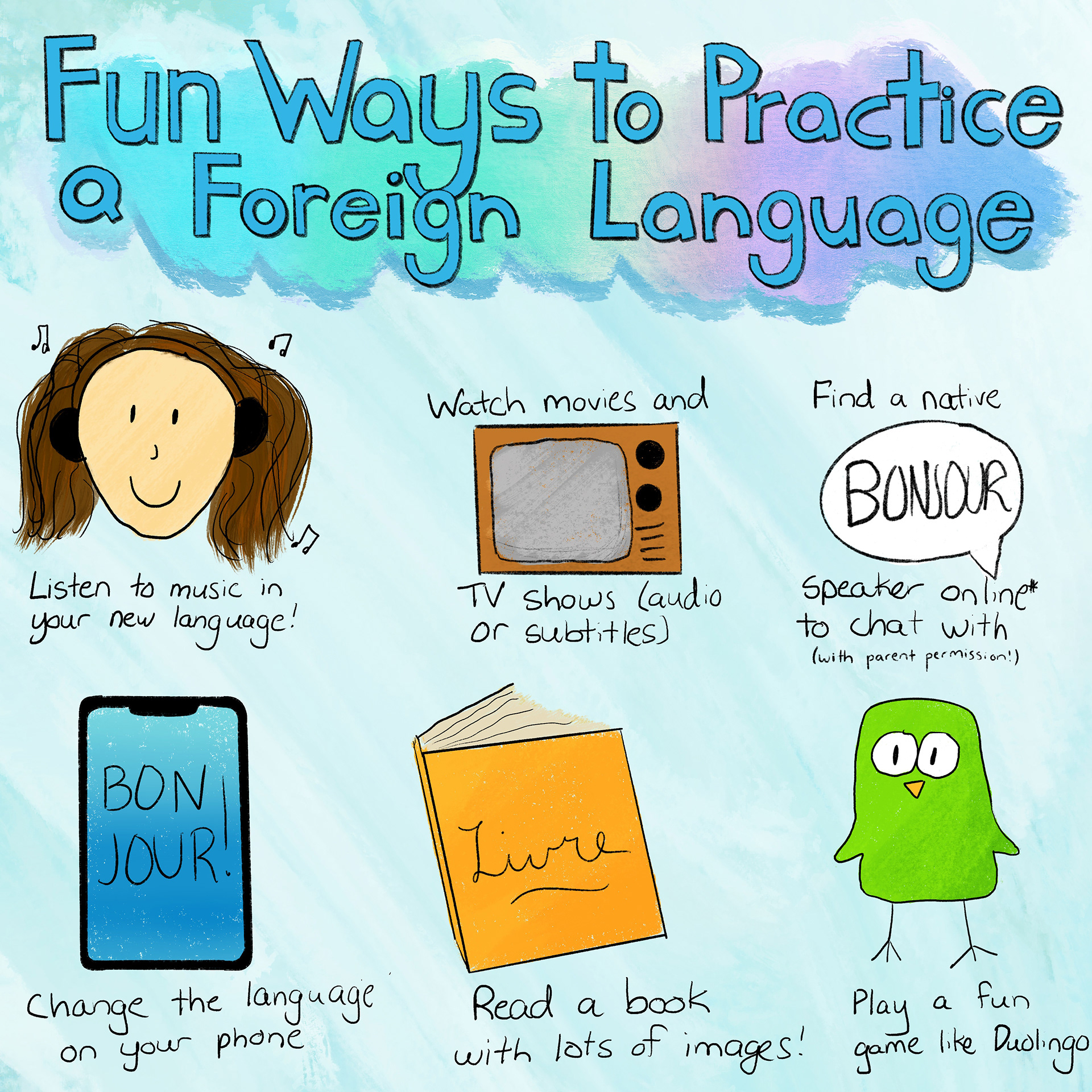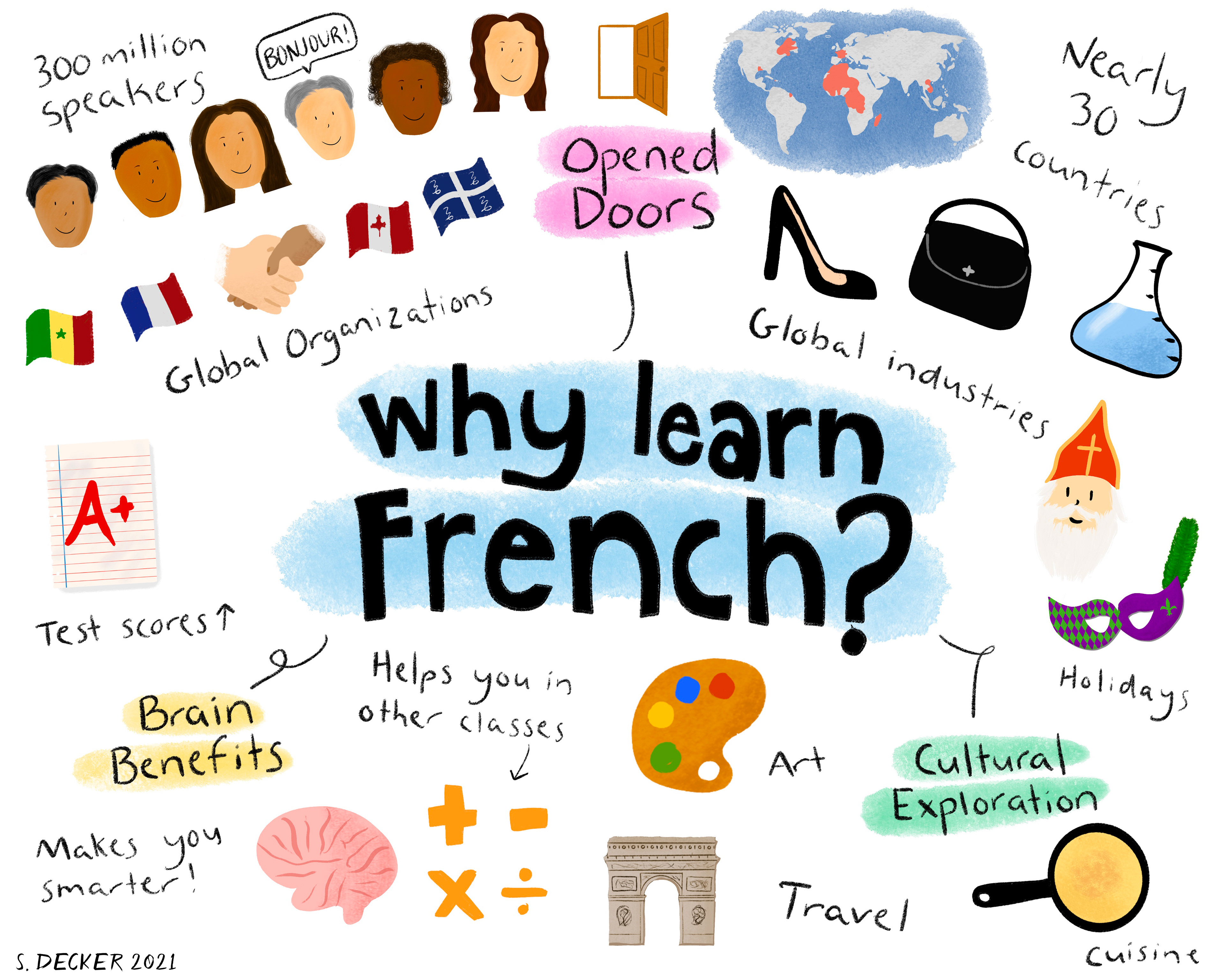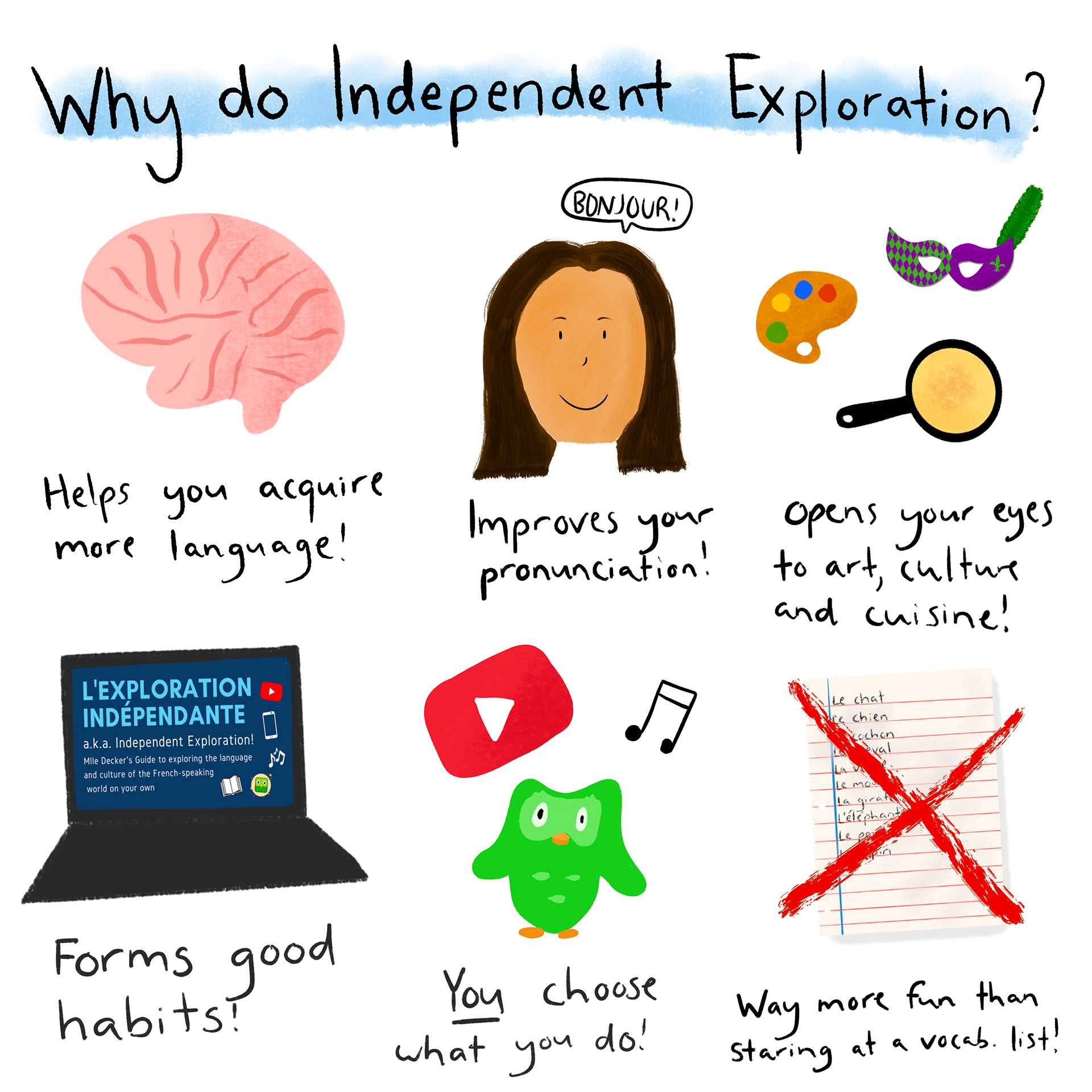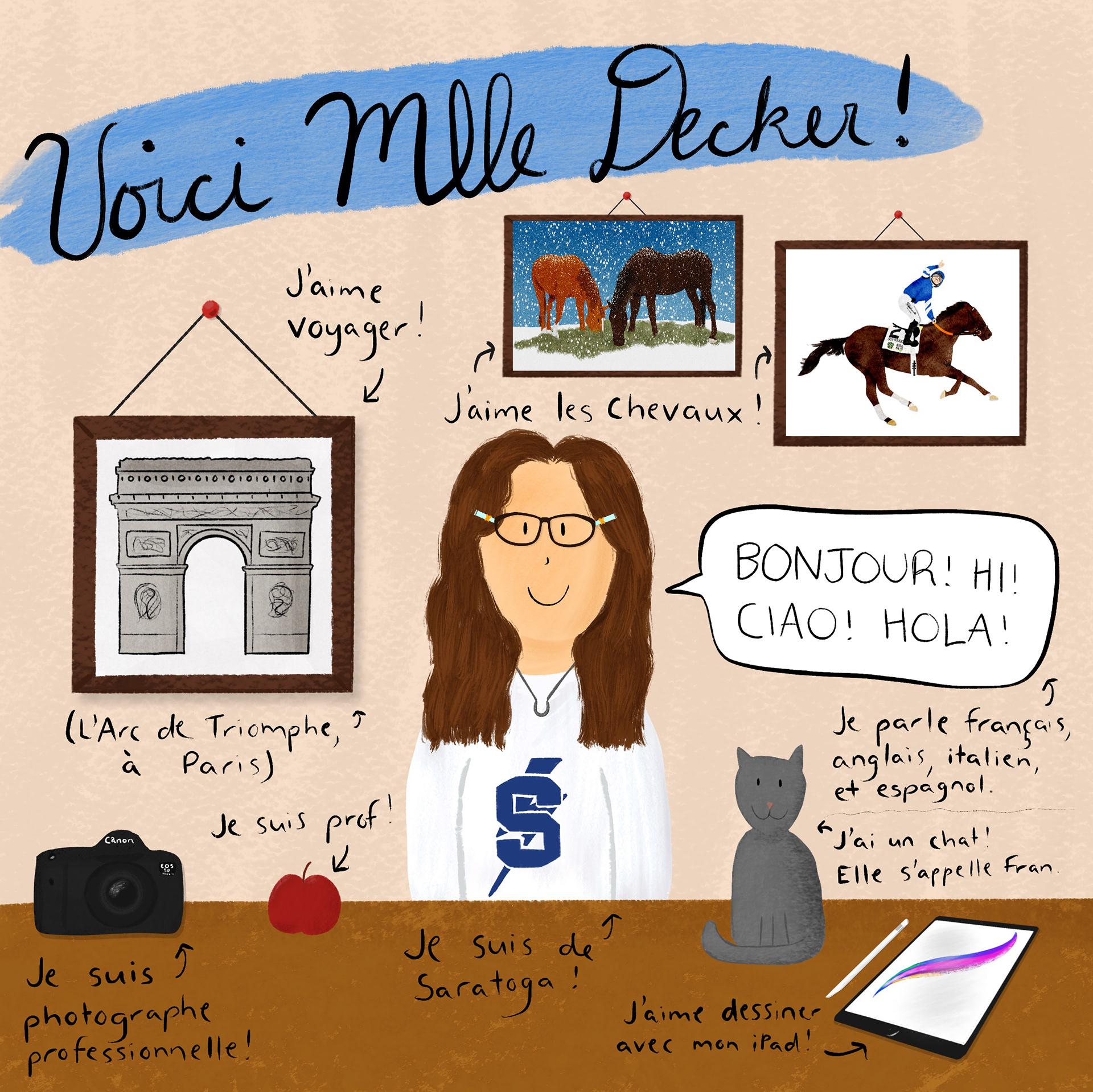As a French teacher, I often incorporate my own illustrations into my teaching. Here are a few of my favorites.